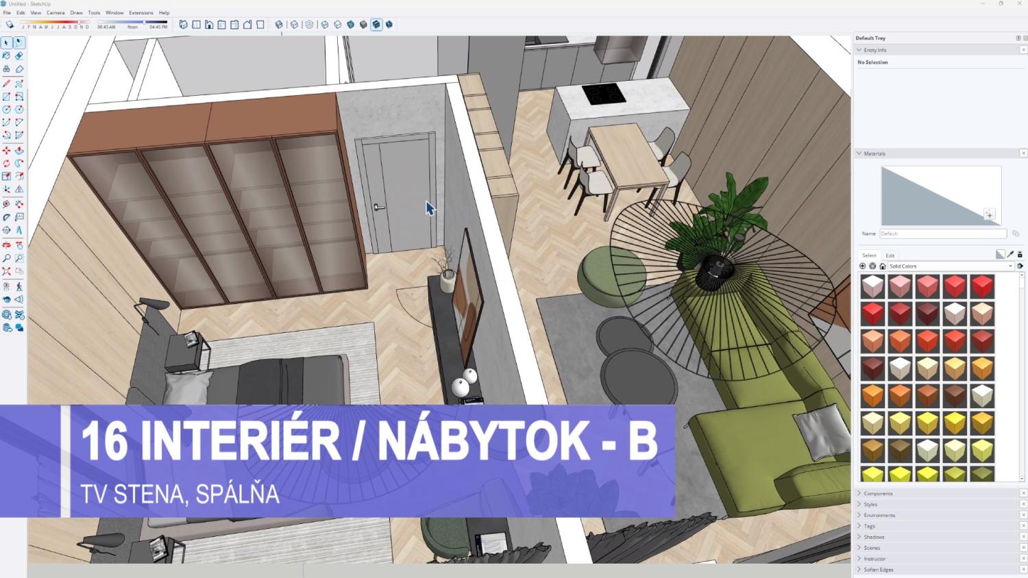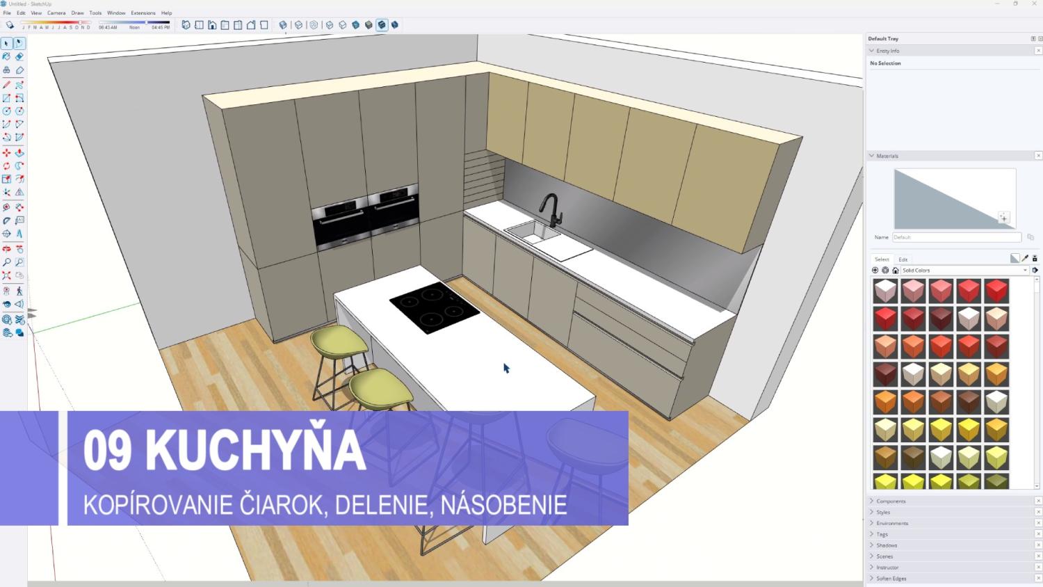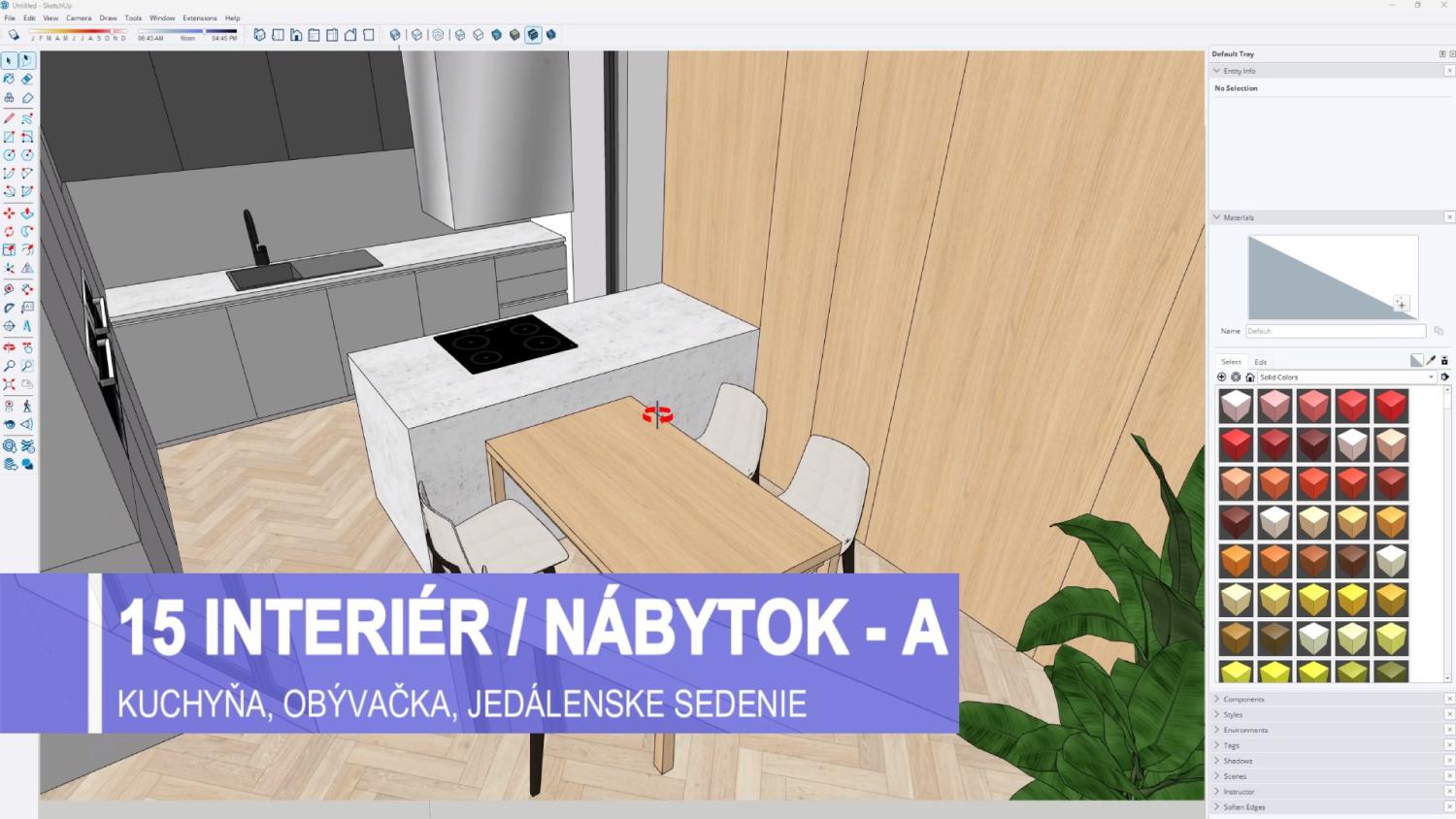 Súčasťou kurzu je aj modelovanie kompletného interiéru vrátane kuchyne, obývačky, spálne a kúpeľne, práca s materiálmi, textúrami, komponentmi a modelmi z 3D Warehouse. Dôraz sa kladie na praktické využitie pri návrhu reálnych priestorov, ergonomické zásady a efektívnu organizáciu modelu pomocou groups a components.