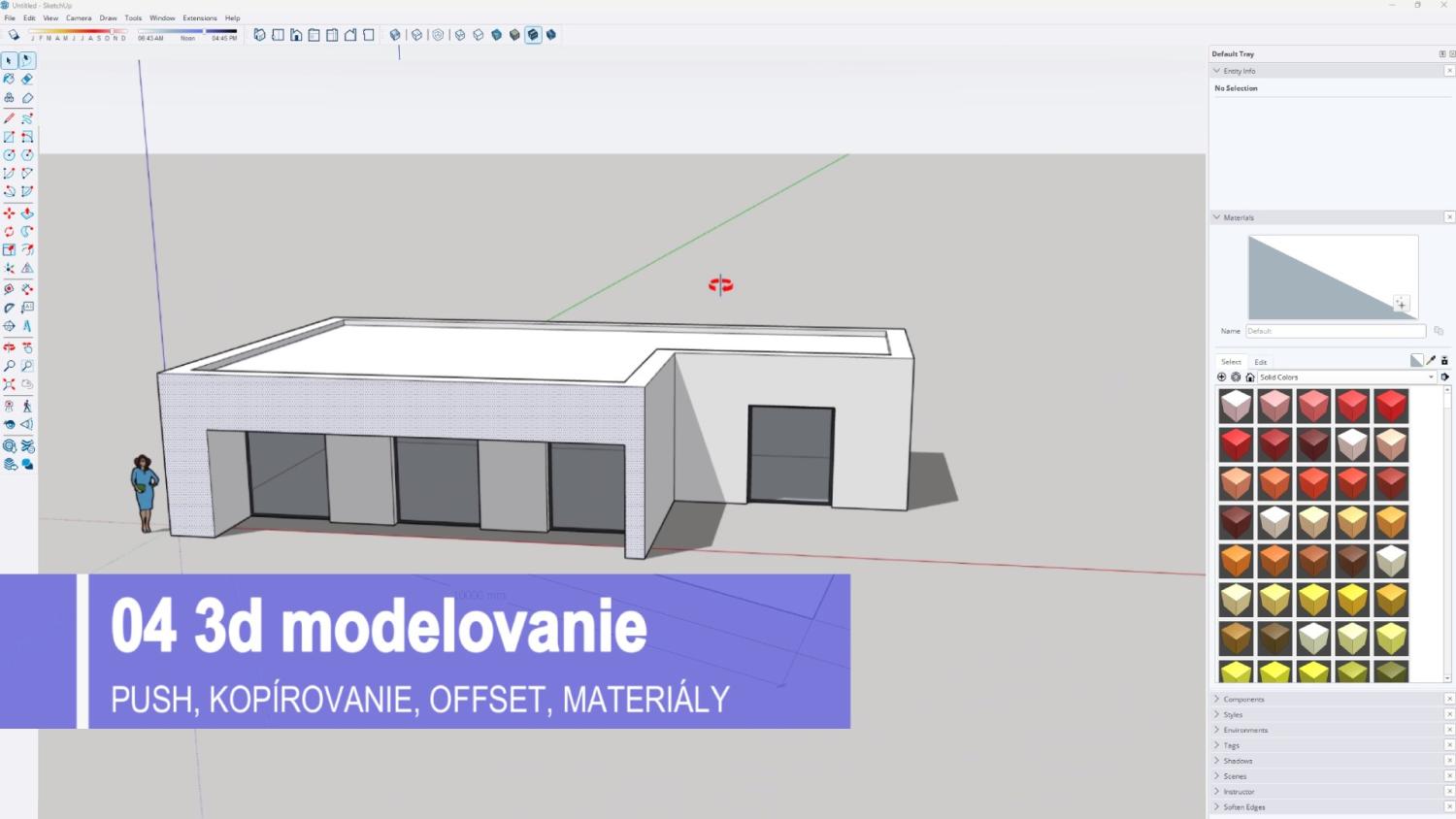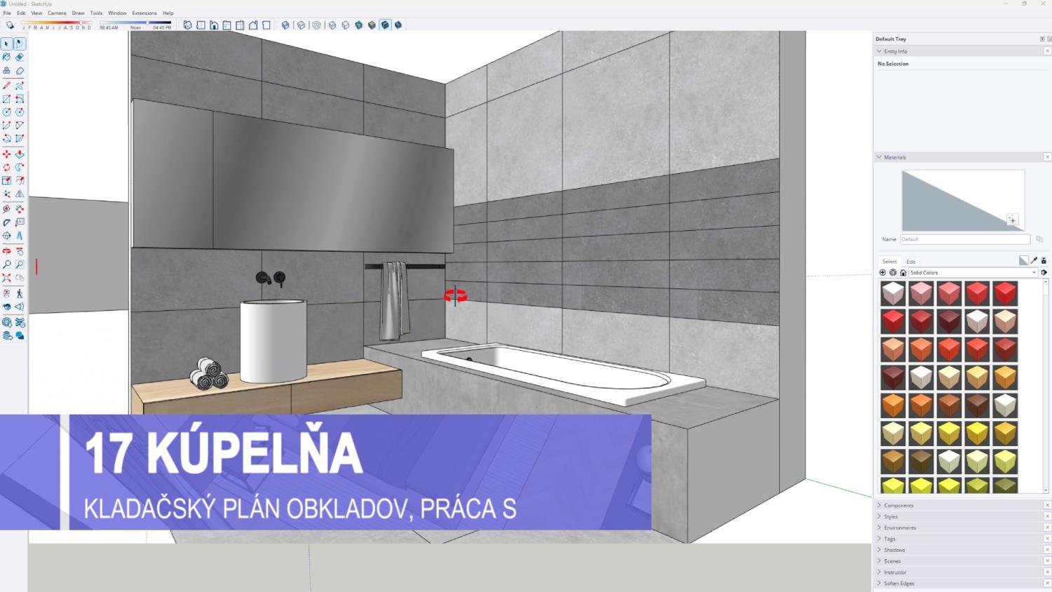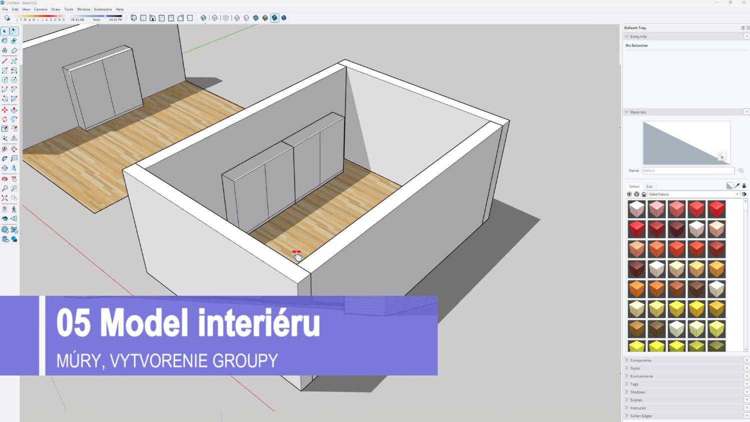Súčasťou kurzu je aj modelovanie kompletného interiéru vrátane kuchyne, obývačky, spálne a kúpeľne, práca s materiálmi, textúrami, komponentmi a modelmi z 3D Warehouse. Dôraz sa kladie na praktické využitie pri návrhu reálnych priestorov, ergonomické zásady a efektívnu organizáciu modelu pomocou groups a components.